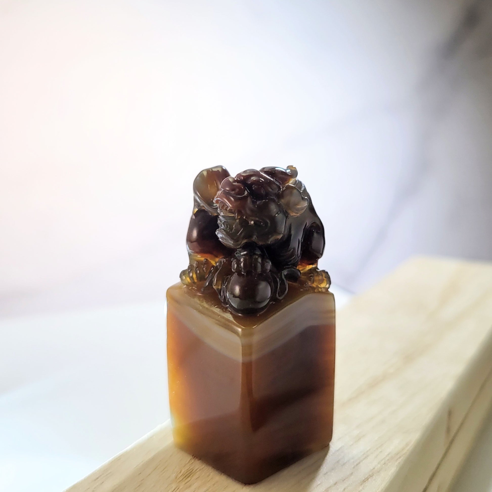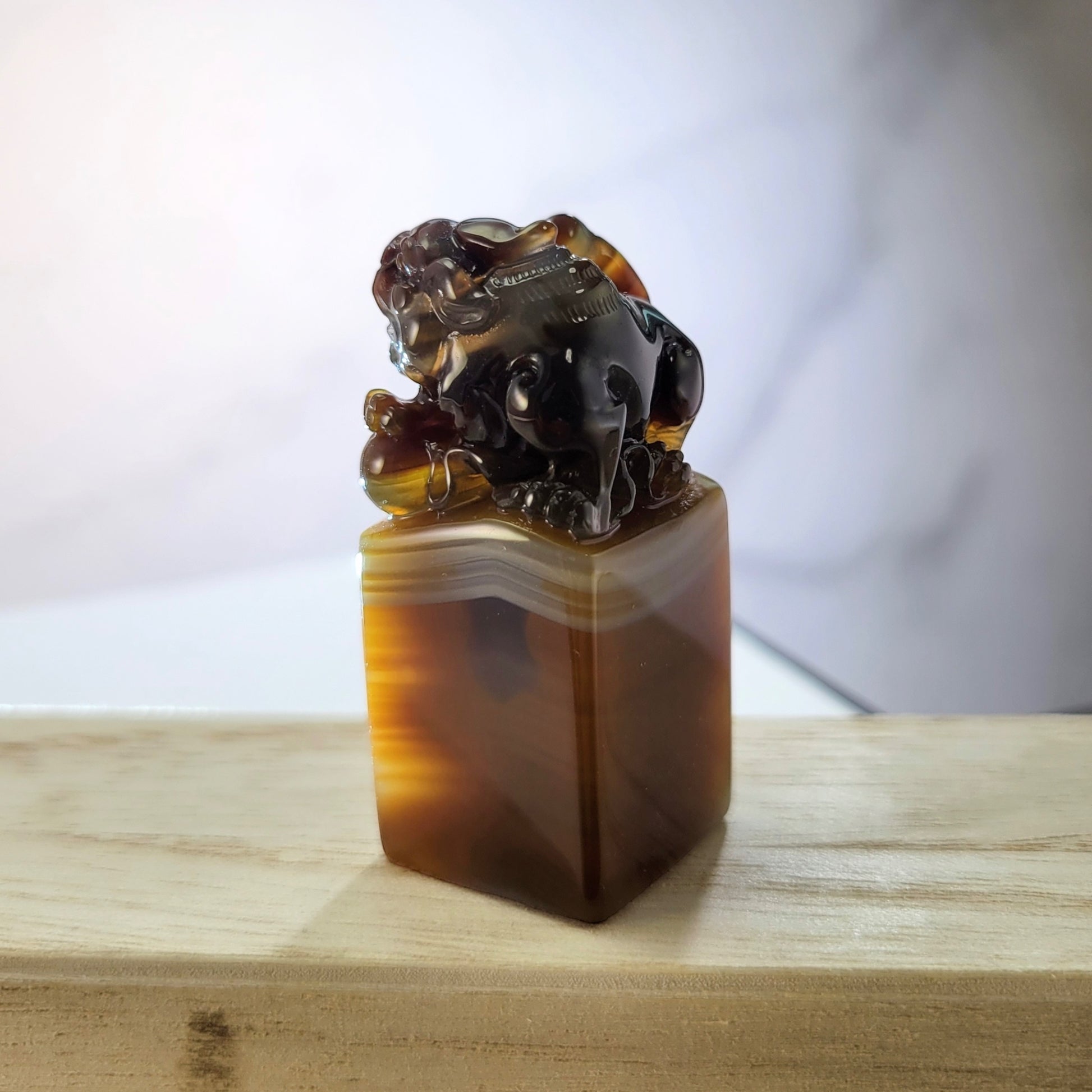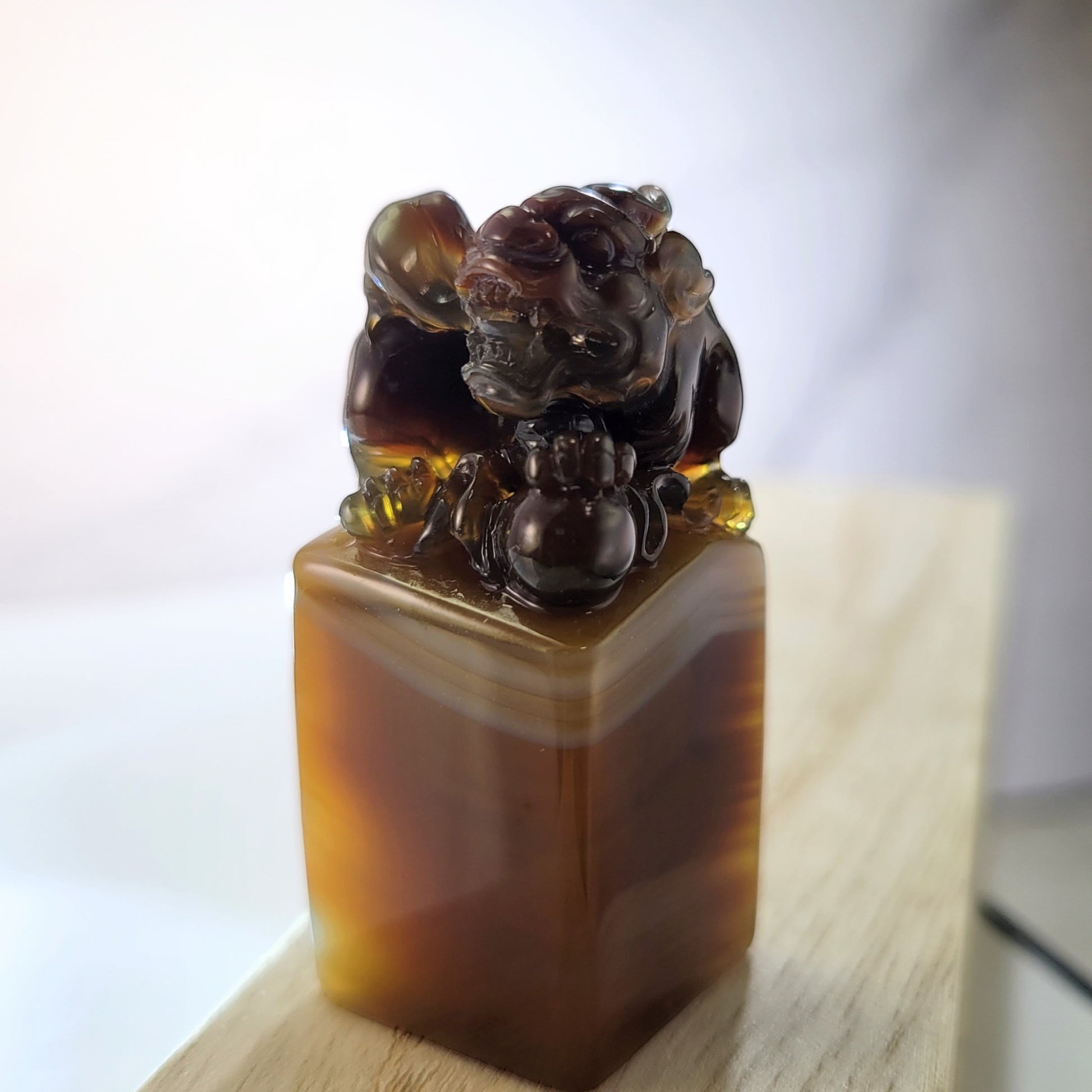 Exquisite agate Chinese lion stamp, carved from a single gemstone with vibrant hues and intricate patterns. Depicts a traditional symbol of strength, courage, and protection, meticulously detailed with powerful muscles, flowing mane, and fierce expression. Functional for creating seals, a unique and thoughtful gift for anyone
