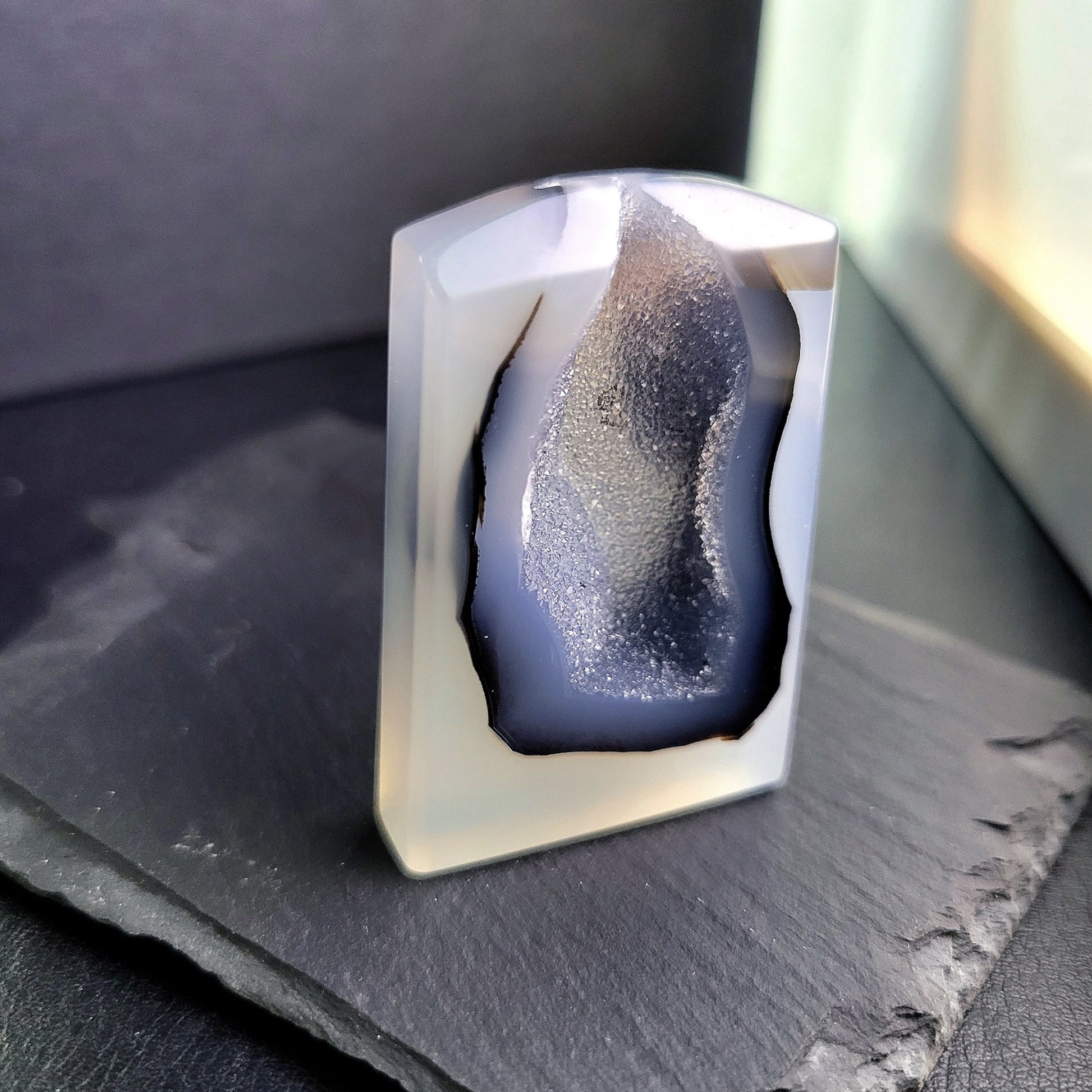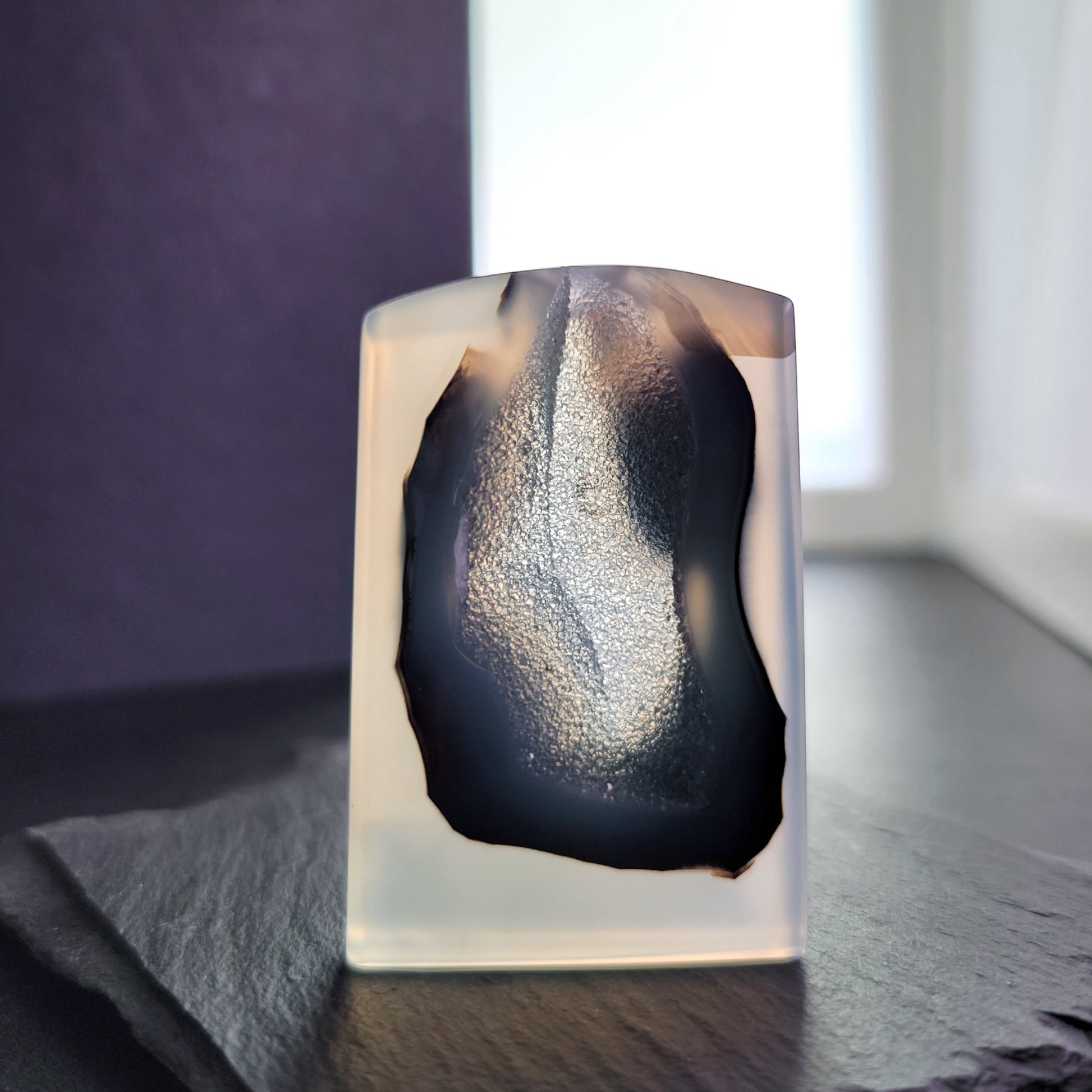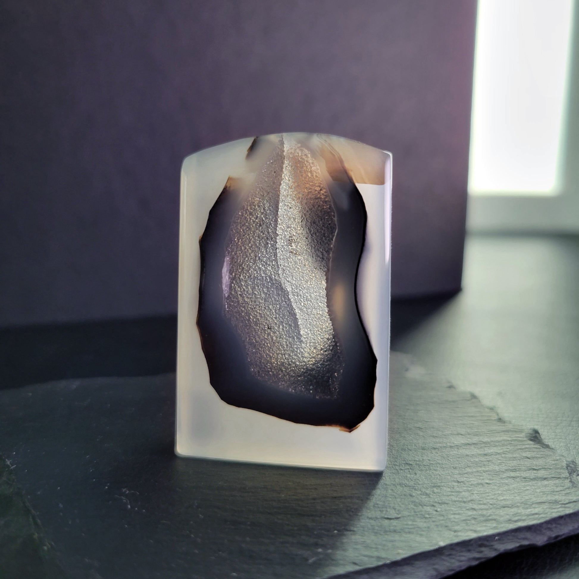 This stunning agate is a gift from nature. Polished to a high shine, it reveals its natural beauty in a variety of patterns and inclusions.