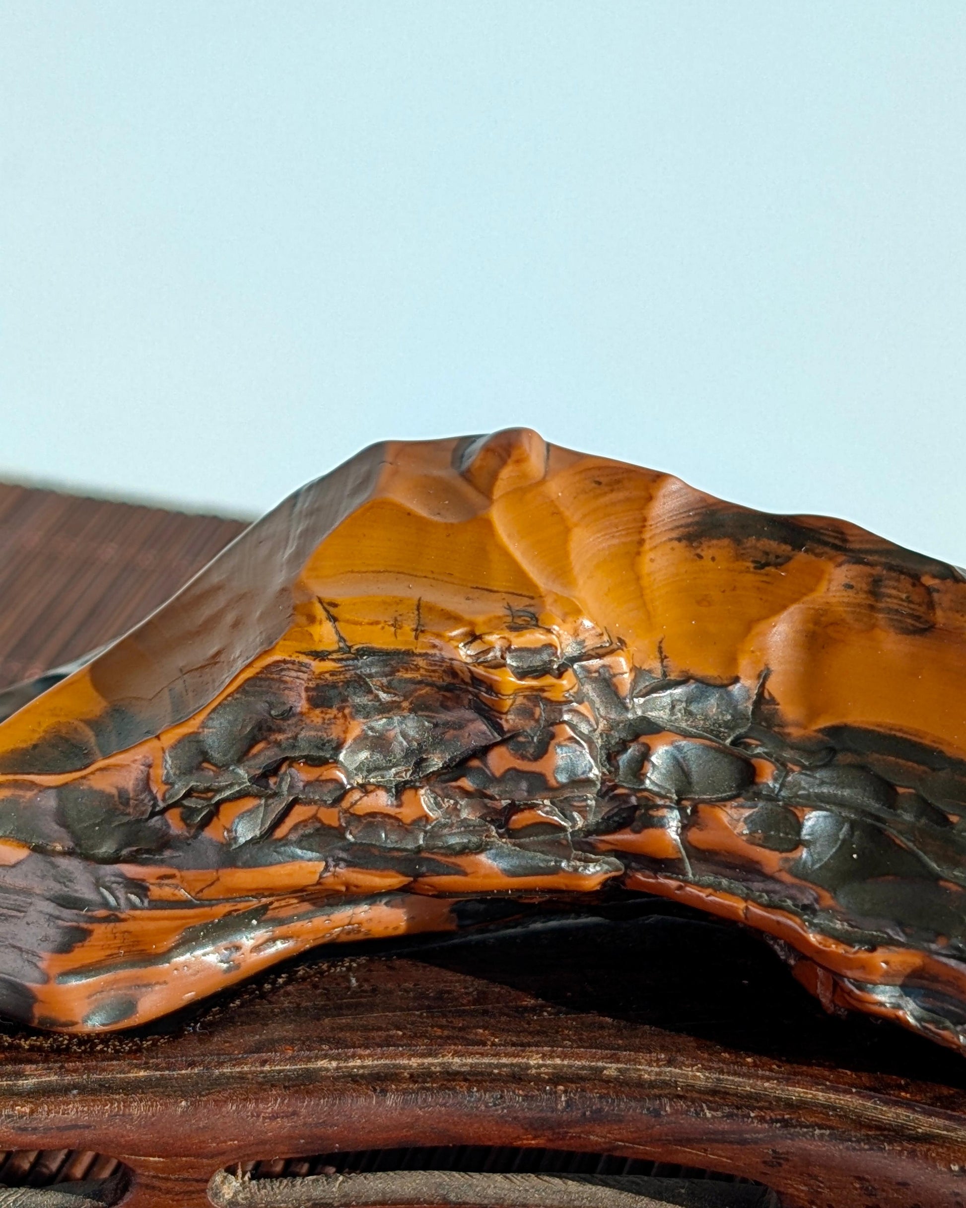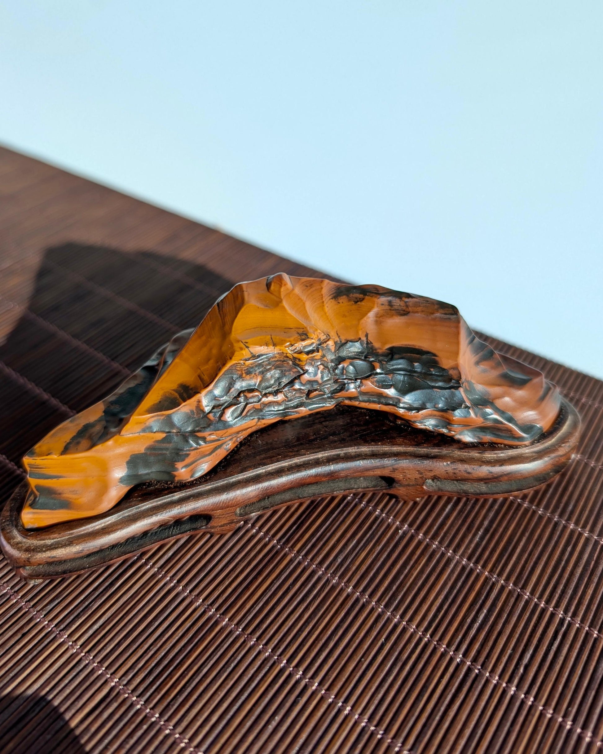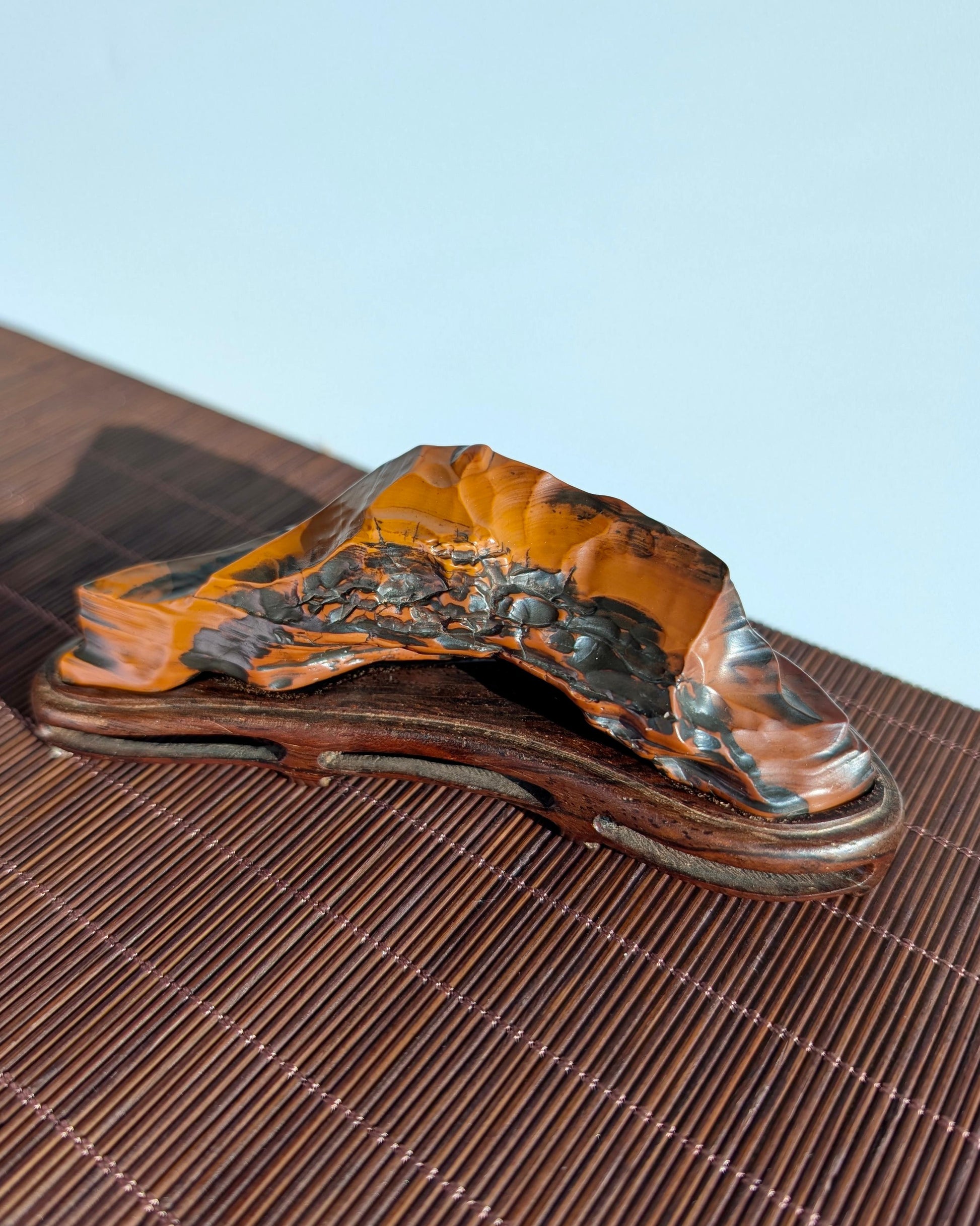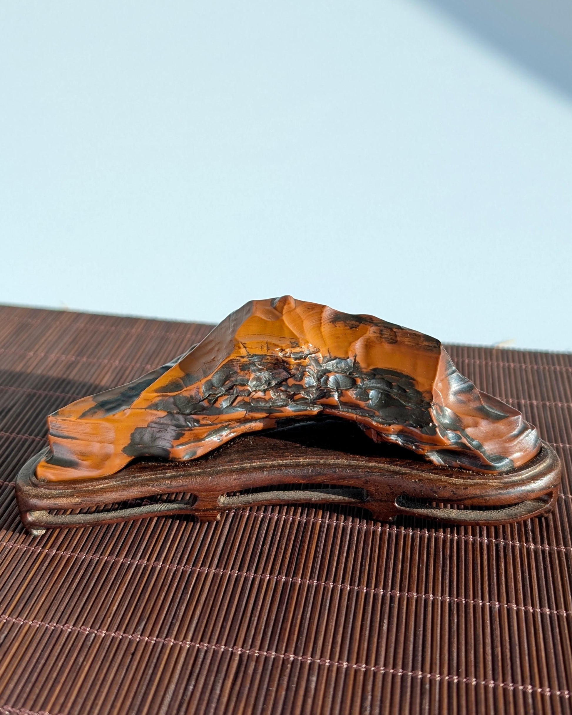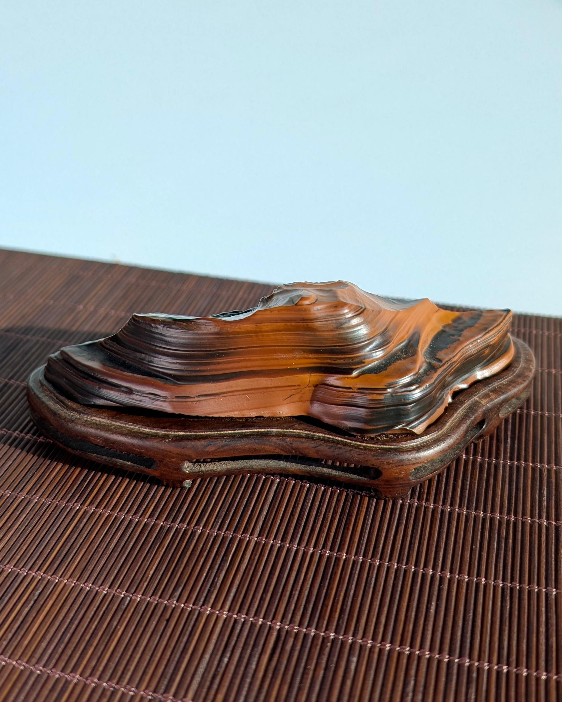 his mountain-shaped Gobi viewing stone features rich earthy tones, exceptional weathering, and a sleek wooden base.